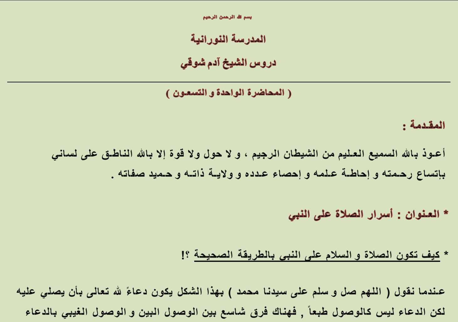 ثم الصالة و السالم خاصة على سيدنا محمد نور األنوار و سر األسرار و زين المرسلين
